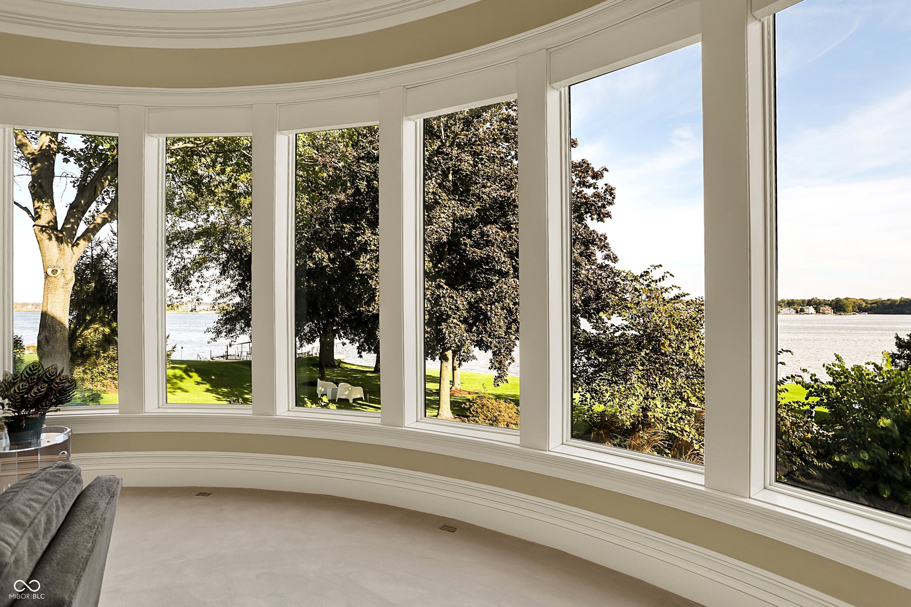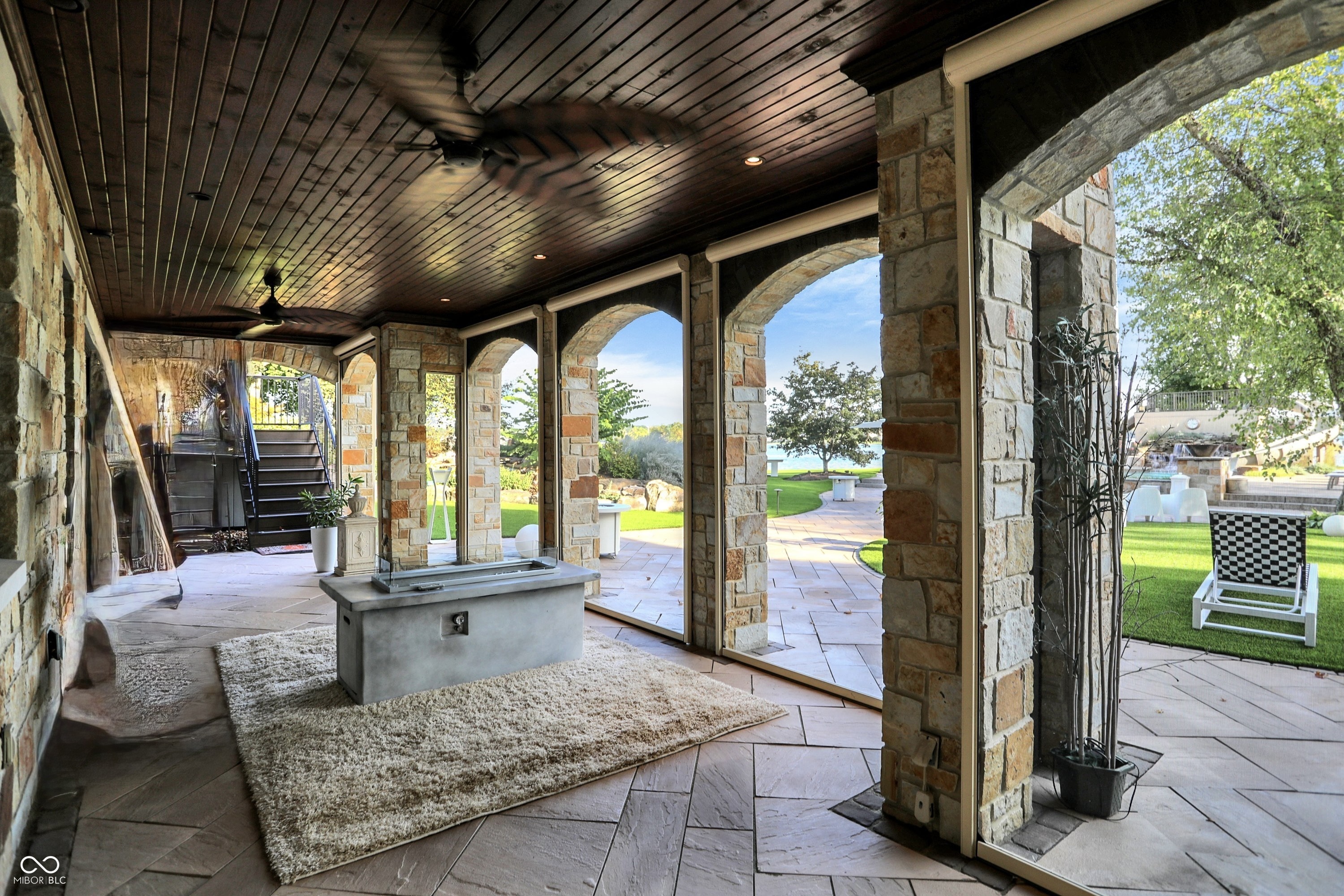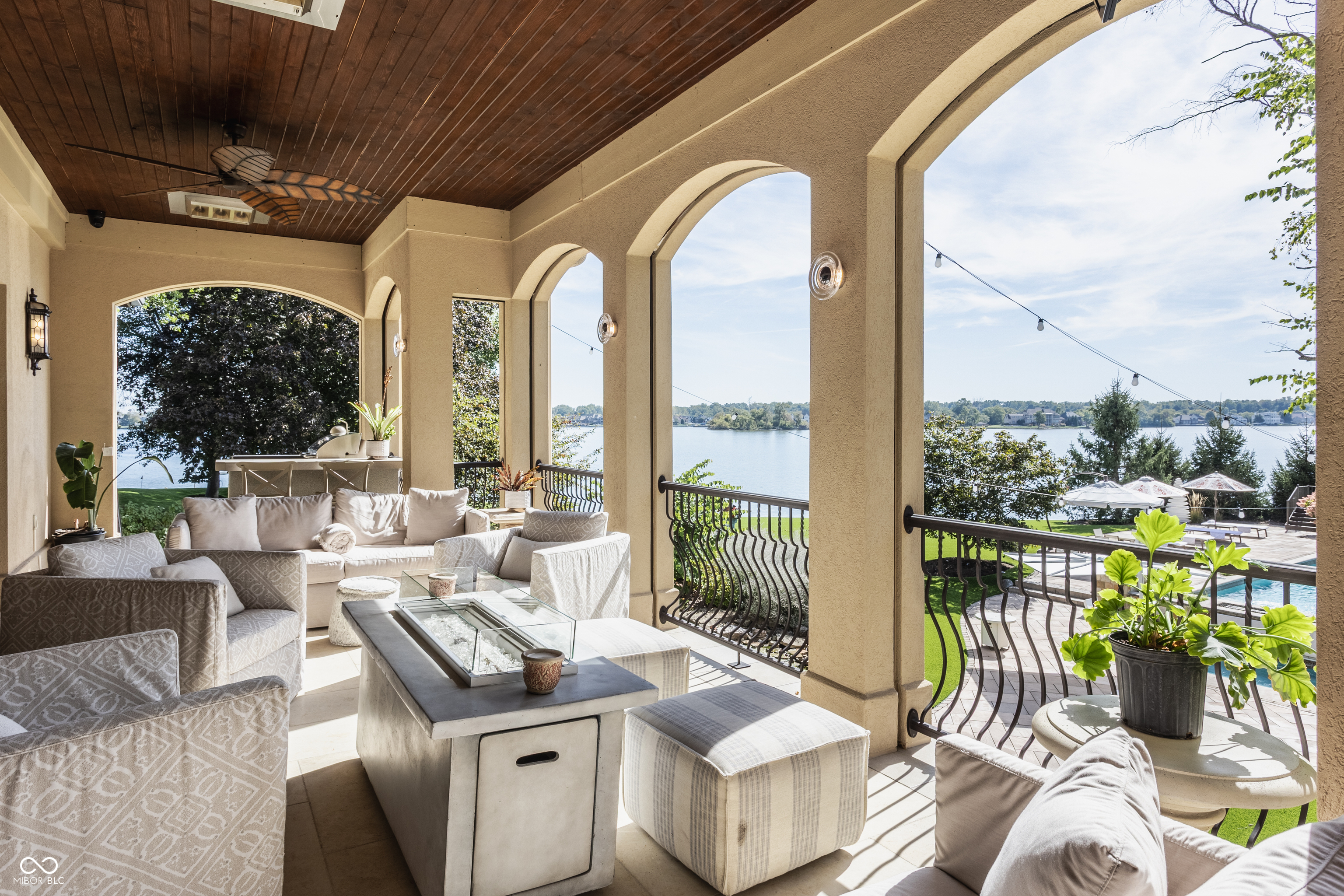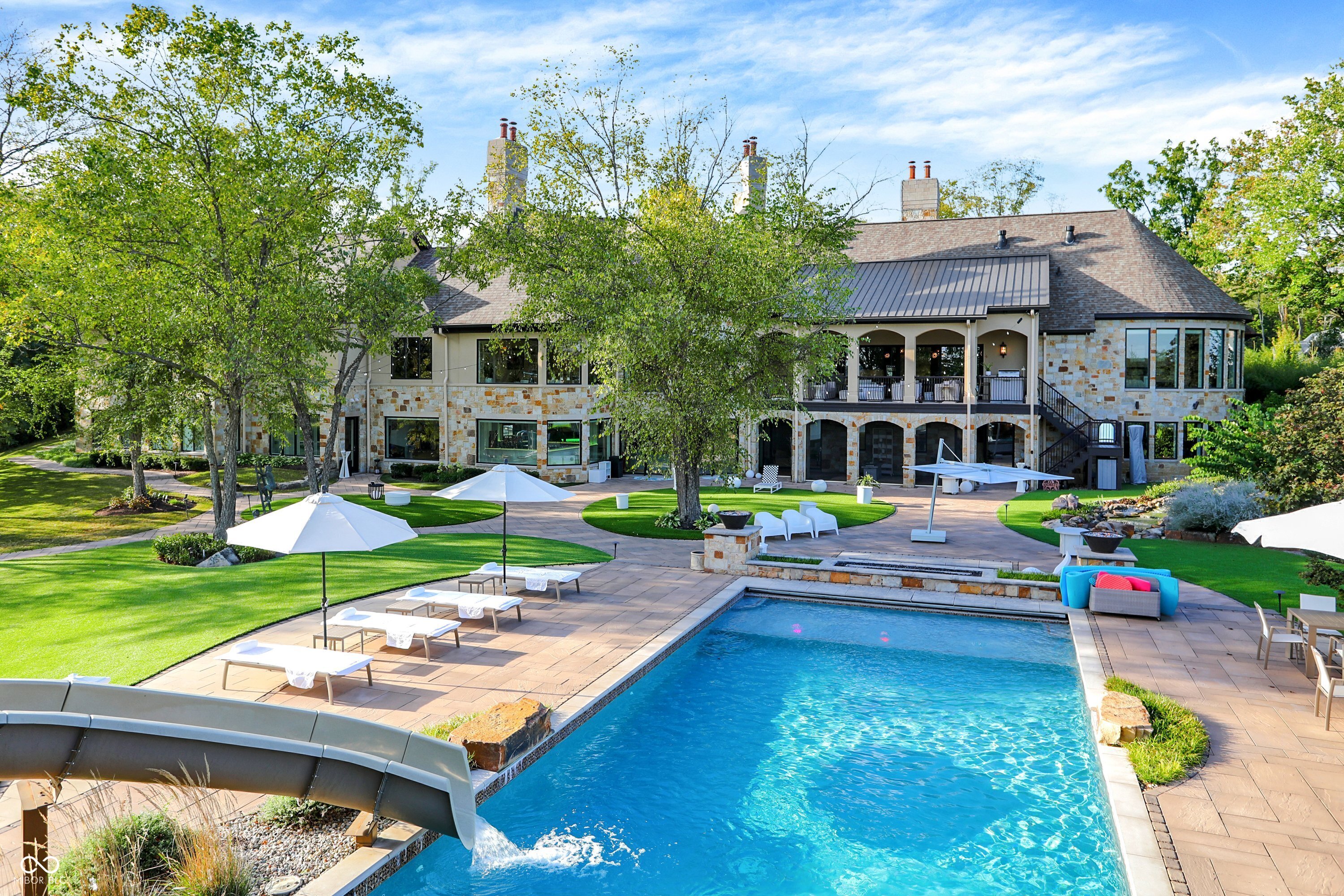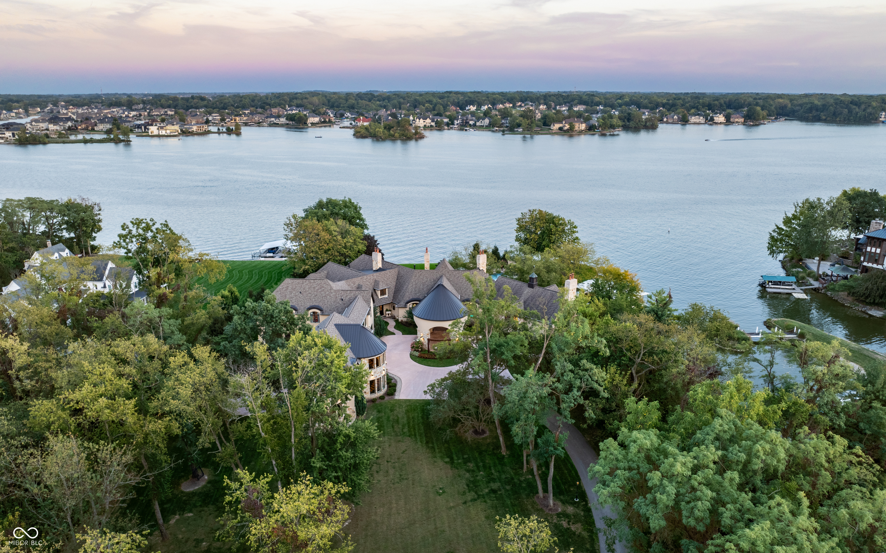Set on 5.23 PRIVATE ACRES with 570' of pristine Geist Reservoir shoreline, this 21,000 sq ft gated waterfront estate redefines Midwestern luxury. A gas-lit, tree-lined drive leads to The Andretti Estate, featuring 9 bedrooms, 12 bathrooms, 7 fireplaces & surrounded by manicured lawns, wooded trails & sweeping open-water views. Inside, craftsmanship & technology merge seamlessly with integrated automation, a three-level elevator & advanced security enhancing everyday life. The main level unfolds with breathtaking vistas from every gathering space, including a fireside study that leads to the estate lounge with bar, billiards area & sitting rooms. The culinary space showcases dual kitchens: a discreet caterer's kitchen is steps away from the primary, featuring commercial-grade appliances, a 14' island, and seamless flow to a 38' heated veranda with grilling area, retractable screens, and sweeping lake views. An elegant anteroom leads to the private owner's wing with a relaxing reading room & coffee nook. A double-sided fireplace is shared with the primary bedroom, its curved walls framing lake views through a full wall of windows. A spa bath rests beneath a glass-tiled barrel ceiling, while 650 sq ft of closet space completes the suite. The upper level offers two wings, one with a loft & 2 en suite bedrooms, the other a guest wing with kitchen, living room, 2 en suite bedrooms, laundry & garage access. The resort-style walkout level presents a 15-seat bar, 700 bottle wine cellar, theater, arcade, billiards room, fitness studio, 4 bedrooms, 5 baths & 4 exterior exits. The outdoor space features a 50' gunite pool with slide, jacuzzi, waterfalls, fire features, multiple patios, a children's play cottage with HVAC & a 50' three-slip boat dock. A newer carriage house includes two 900 sq ft apartments, each with a kitchen, en suite bedroom, living room, laundry & 2-car garage. 5,500 sq ft of climate-controlled garage space with 12+ bays completes this unparalleled estate.