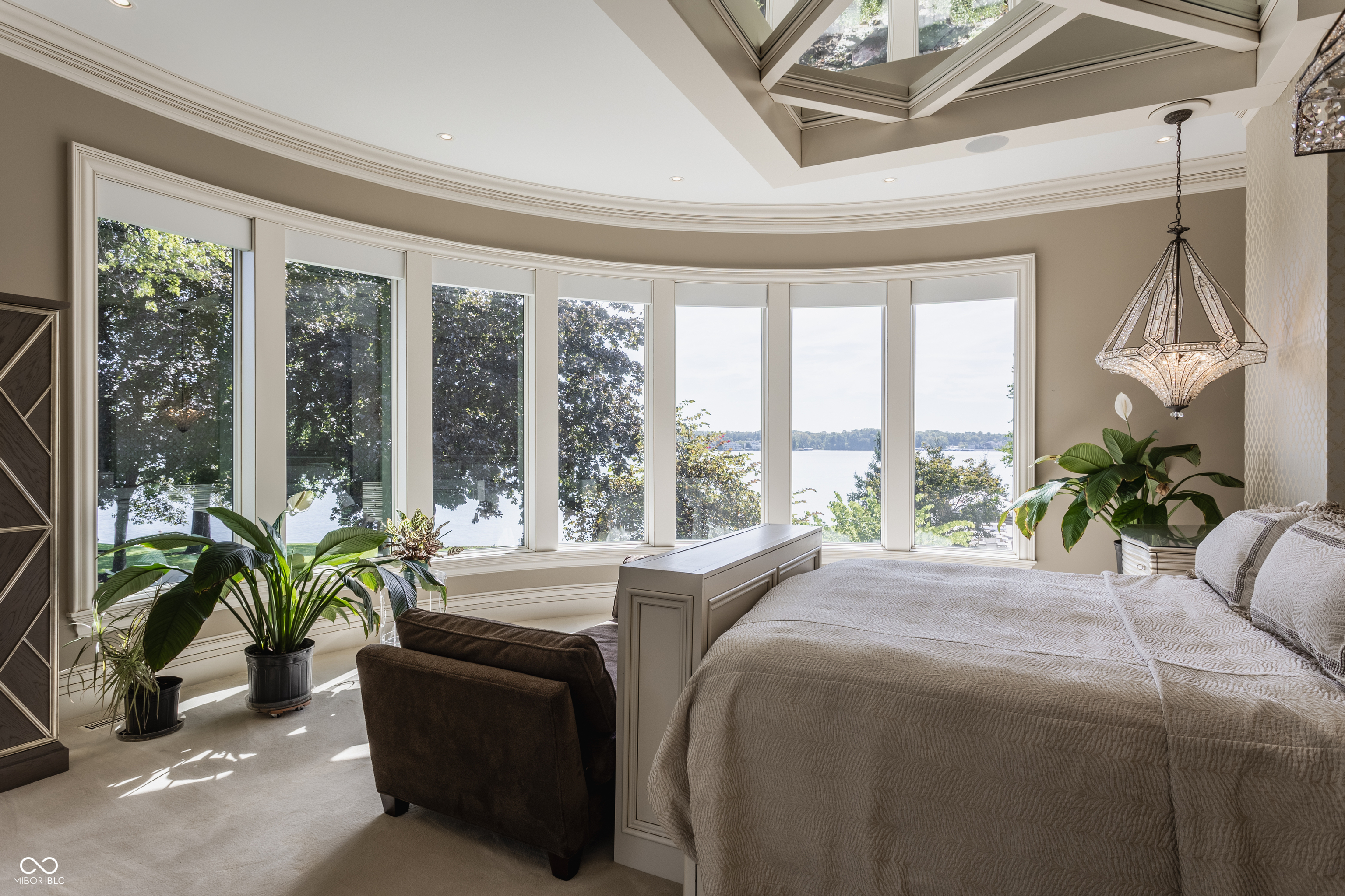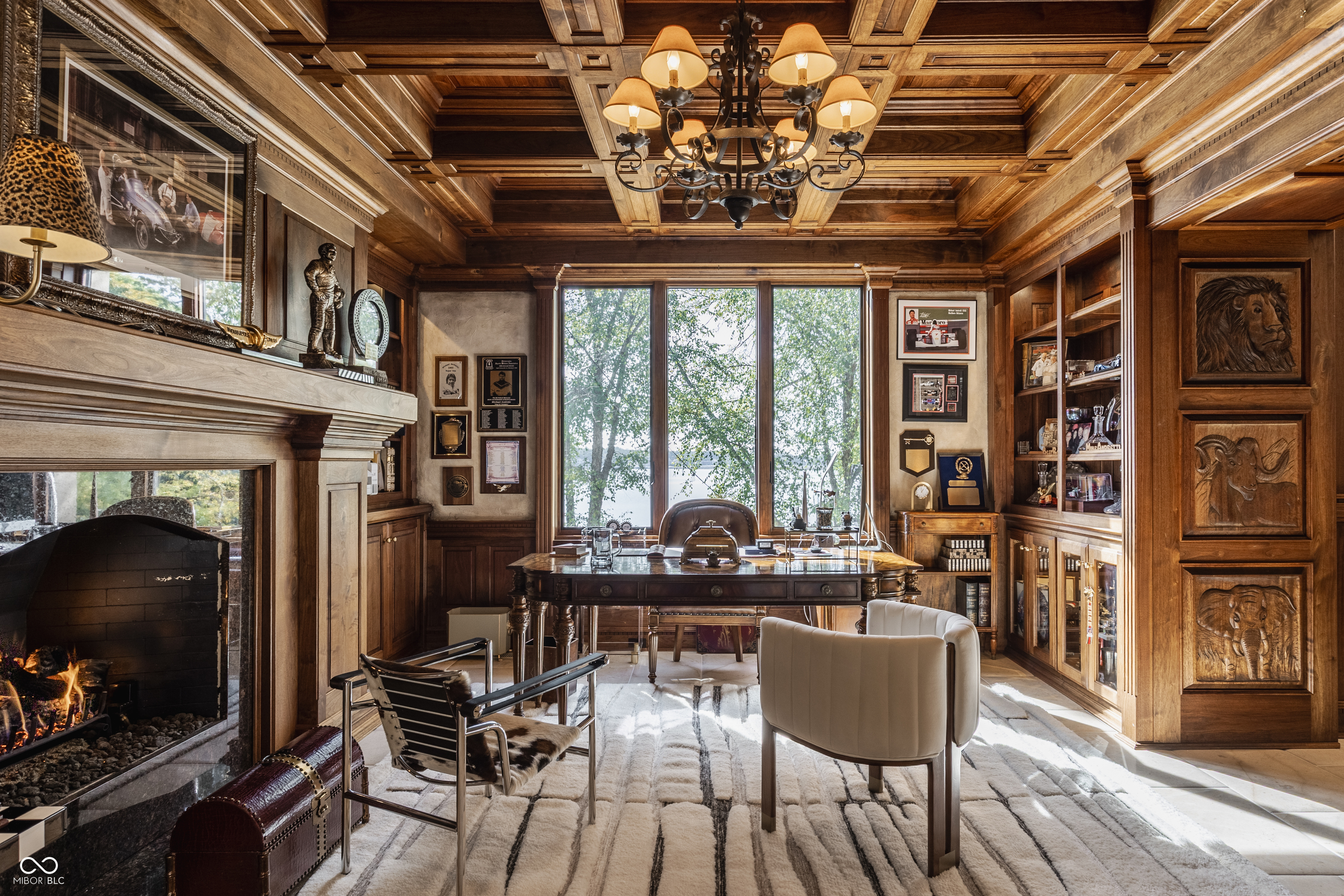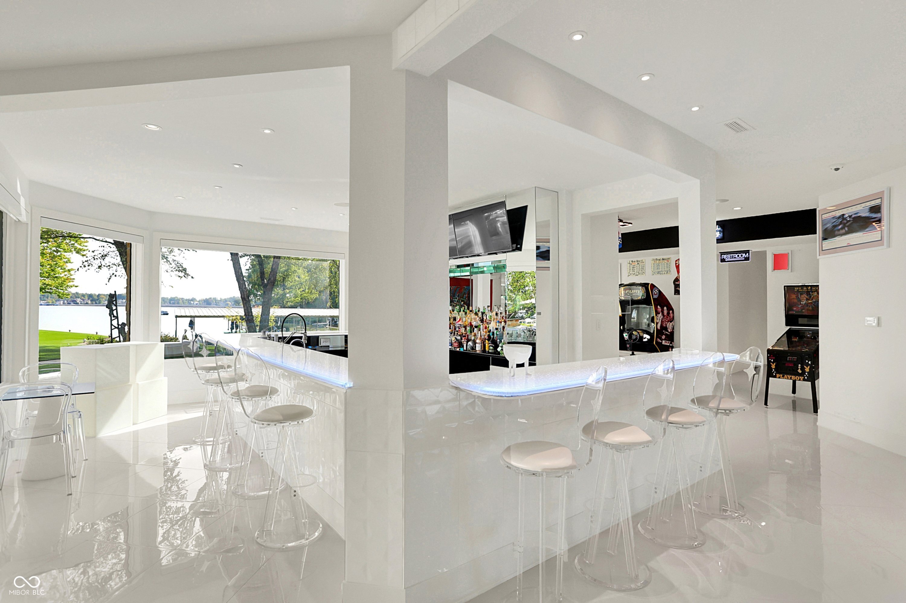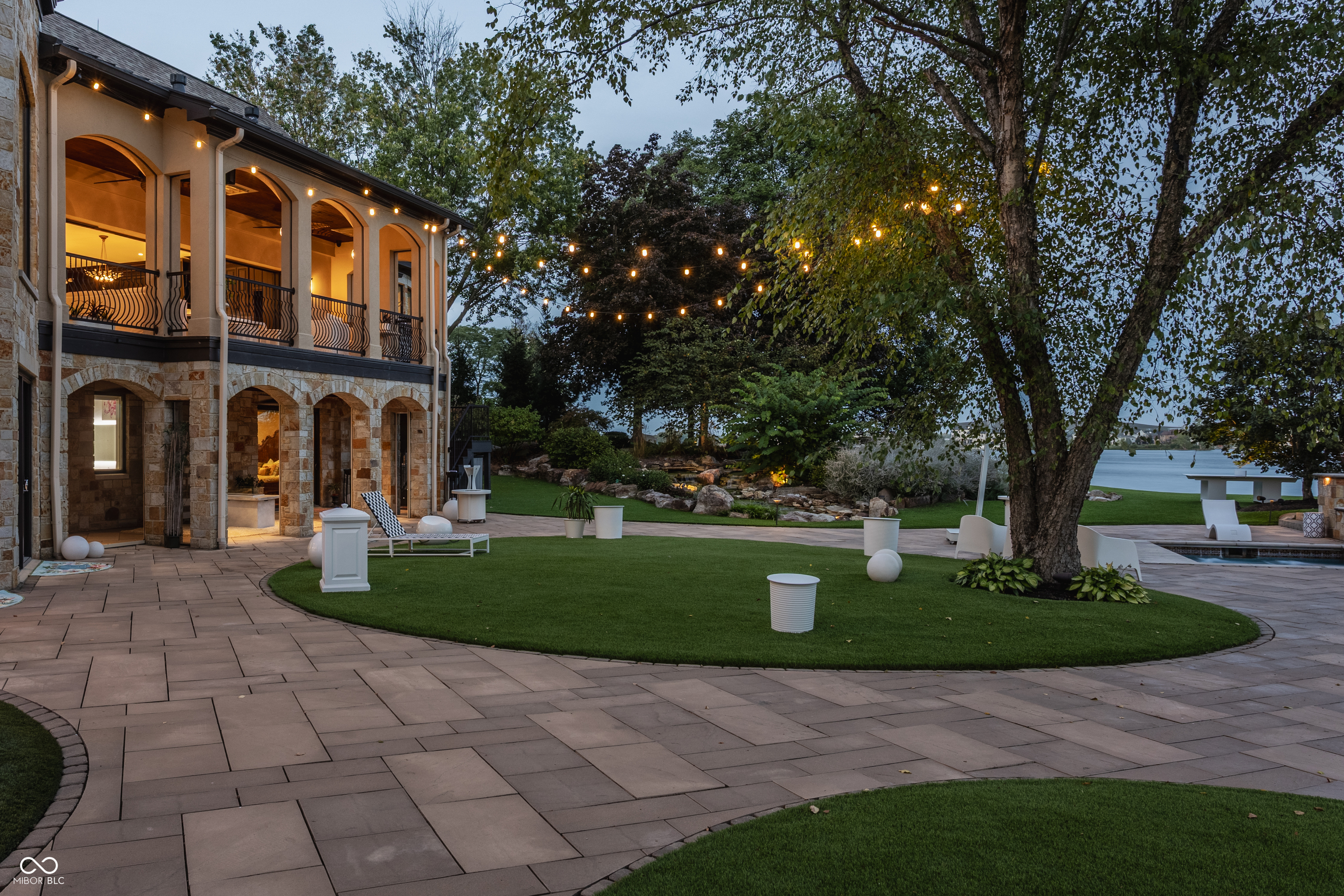 Set on 5.23 PRIVATE ACRES with 570' of pristine Geist Reservoir shoreline, this 21,000 sq ft gated waterfront estate redefines Midwestern luxury. A gas-lit, tree-lined drive leads to The Andretti Estate, featuring 9 bedrooms, 12 bathrooms, 7 fireplaces & surrounded by manicured lawns, wooded trails & sweeping open-water views. Inside, craftsmanship & technology merge seamlessly with integrated automation, a three-level elevator & advanced security enhancing everyday life. The main level unfolds with breathtaking vistas from every gathering space, including a fireside study that leads to the estate lounge with bar, billiards area & sitting rooms. The culinary space showcases dual kitchens: a discreet caterer's kitchen is steps away from the primary, featuring commercial-grade appliances, a 14' island, and seamless flow to a 38' heated veranda with grilling area, retractable screens, and sweeping lake views. An elegant anteroom leads to the private owner's wing with a relaxing reading room & coffee nook. A double-sided fireplace is shared with the primary bedroom, its curved walls framing lake views through a full wall of windows. A spa bath rests beneath a glass-tiled barrel ceiling, while 650 sq ft of closet space completes the suite. The upper level offers two wings, one with a loft & 2 en suite bedrooms, the other a guest wing with kitchen, living room, 2 en suite bedrooms, laundry & garage access. The resort-style walkout level presents a 15-seat bar, 700 bottle wine cellar, theater, arcade, billiards room, fitness studio, 4 bedrooms, 5 baths & 4 exterior exits. The outdoor space features a 50' gunite pool with slide, jacuzzi, waterfalls, fire features, multiple patios, a children's play cottage with HVAC & a 50' three-slip boat dock. A newer carriage house includes two 900 sq ft apartments, each with a kitchen, en suite bedroom, living room, laundry & 2-car garage. 5,500 sq ft of climate-controlled garage space with 12+ bays completes this unparalleled estate.