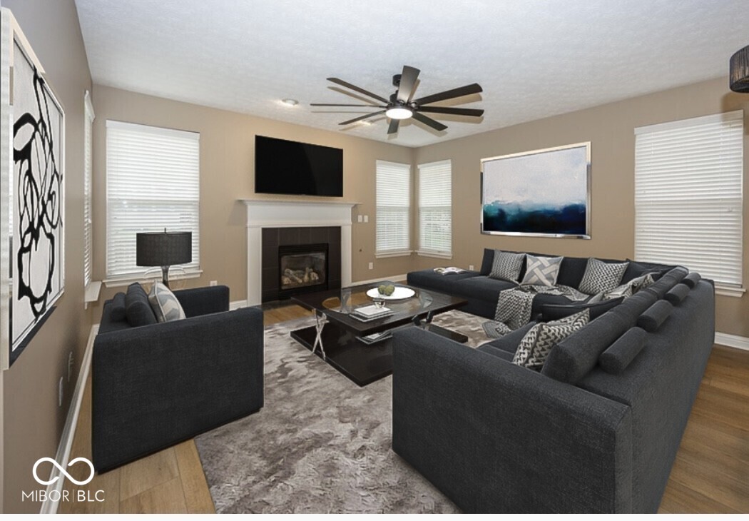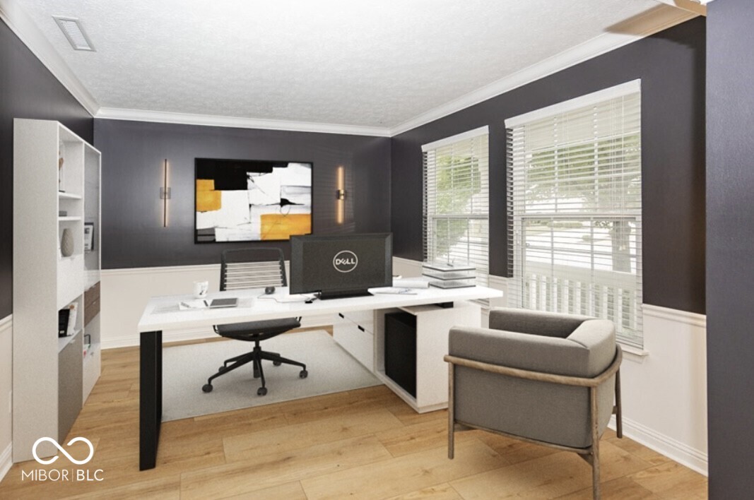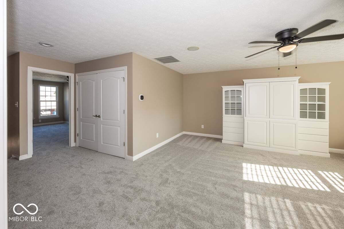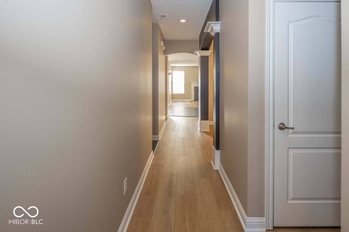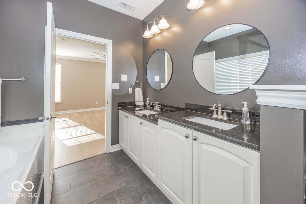 This stunning move-in-ready former model home in highly sought-after Chapel Woods offers timeless design and modern updates throughout. Featuring elegant crown molding, columns, arched entryways, and 9-foot ceilings, this home includes all-new waterproof vinyl plank flooring on the main level, new carpet upstairs, fresh paint and trim, updated lighting fixtures, and refreshed landscaping. The updated kitchen features granite countertops, a stylish backsplash, stainless steel appliances, a bar stool area, a separate eat-in Breakfast Area and a nice-sized pantry. The bathrooms have all been updated with granite counter tops and modern finishes. The spacious layout includes a large family room with a gas log fireplace, formal dining w niche area, a main level office with detailed trim work, and a main-level primary suite with crown molding, a walk-in closet, and a luxurious updated bathroom featuring double vanities, a garden tub, and a separate shower. Upstairs you'll find three oversized bedrooms, all with walk-in closets, a large bonus room with a built-in entertainment center. The mudroom off the three-car garage provides ample storage, and the third bay is a hobbyist's dream with a custom closed off workshop and lots of built-in shelving. Outdoor living spaces include a massive covered front porch and a back patio perfect for relaxing or entertaining. Many updates include a new roof (2022), HVAC system (2022), upstairs windows (2024), exterior paint (2024), water heater (2025), new flooring (2025), interior paint (2025), new lighting (2025) and granite (2025). Additional features include an irrigation system, generator hookup, and security system. Located close to dining, shopping, and Noblesville Schools, Chapel Woods offers a neighborhood pool, playground and golf-cart-friendly streets. With every detail updated, this home is completely move-in ready!