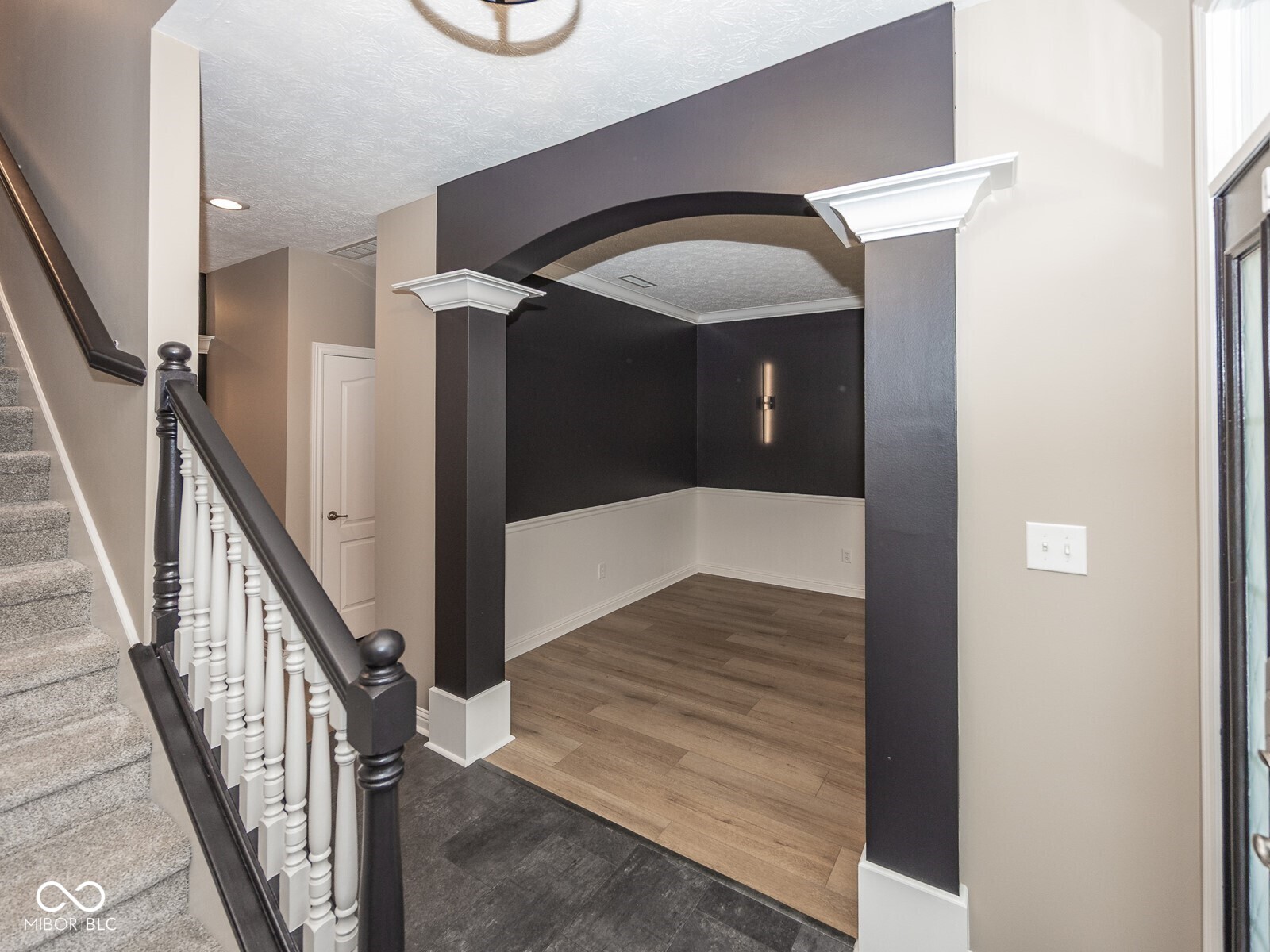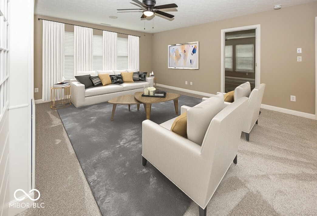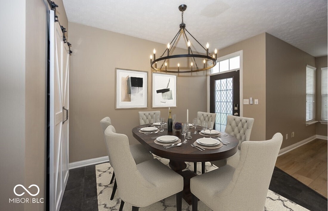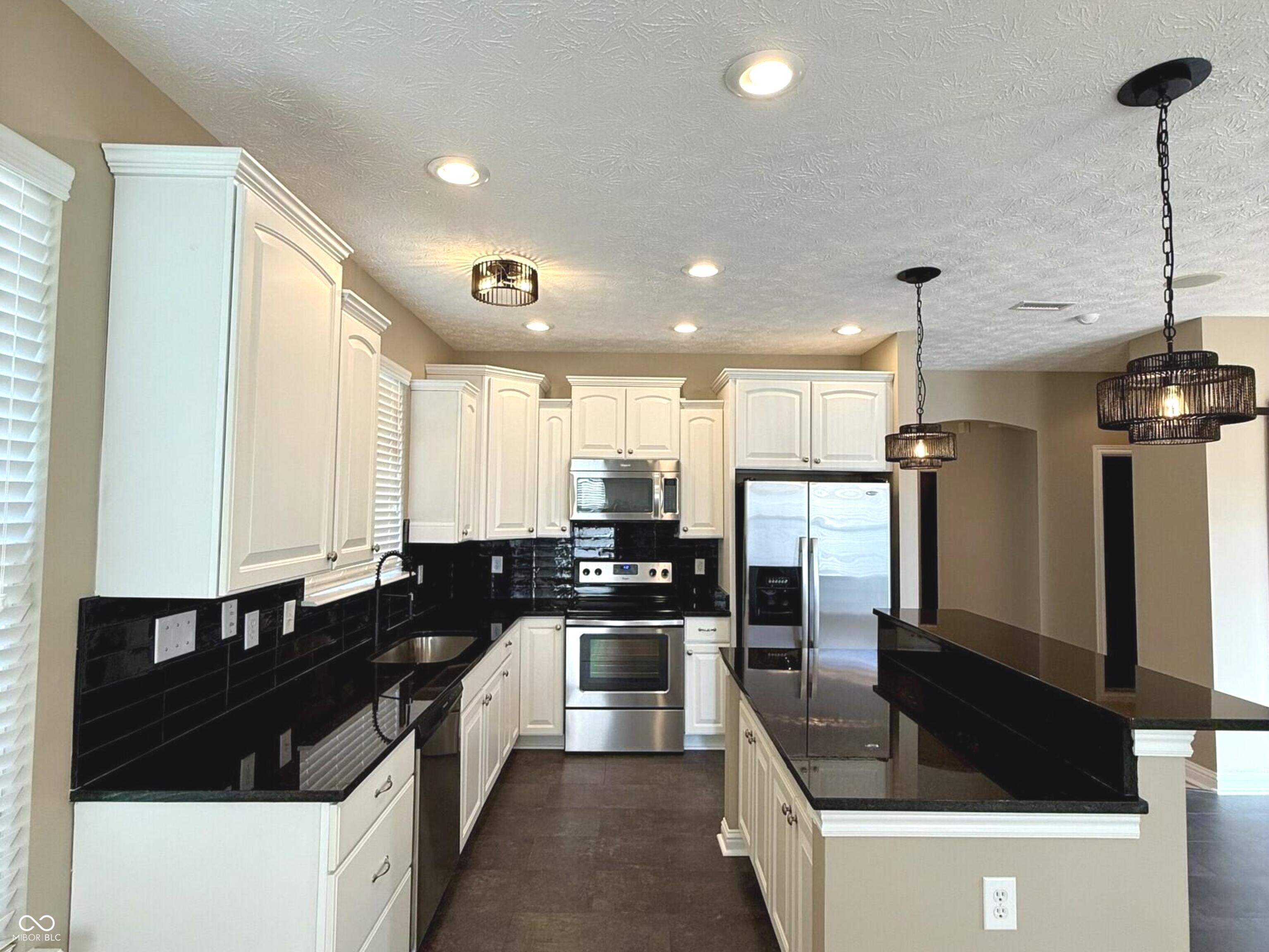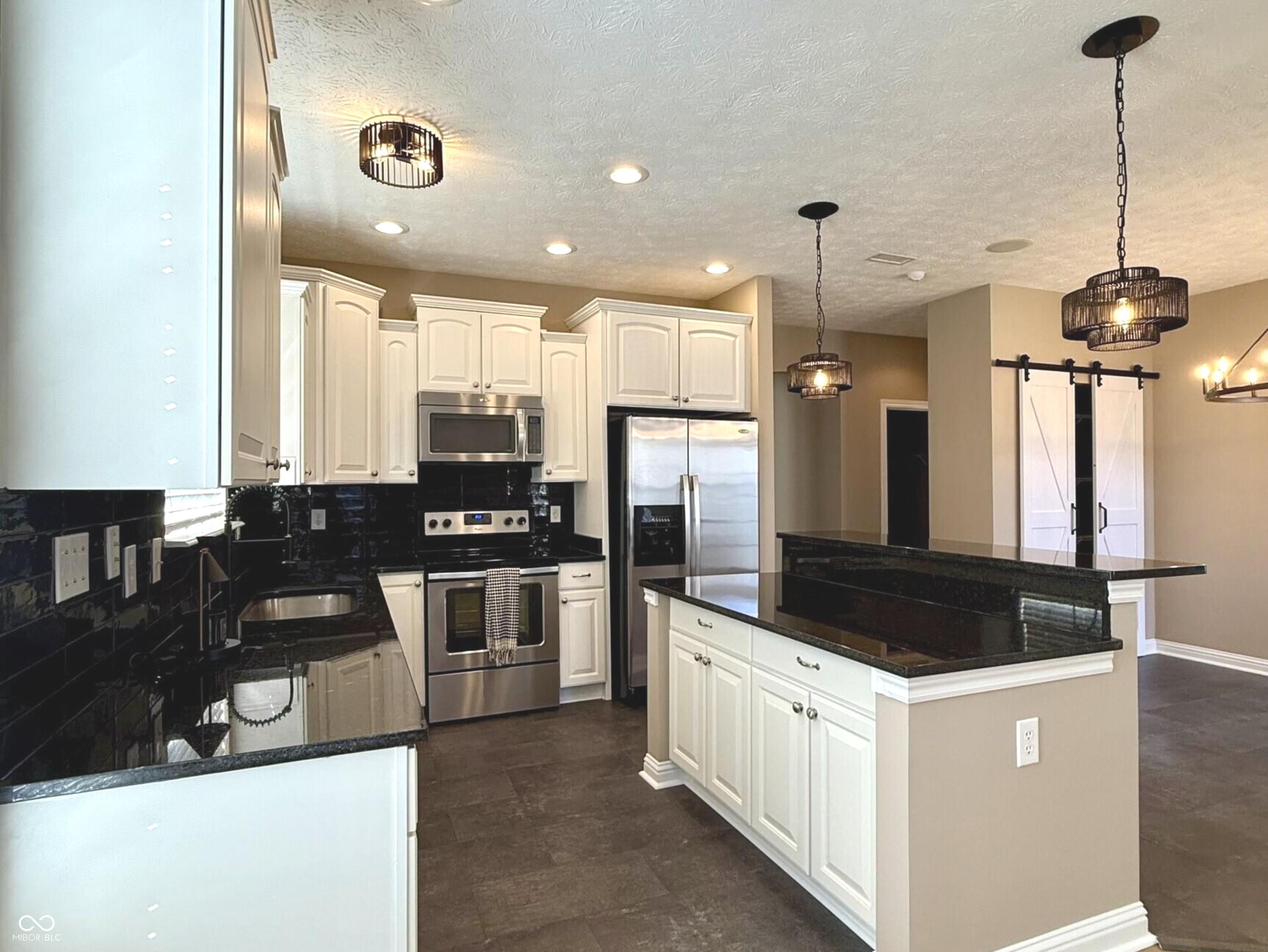 This stunning move-in-ready former model home in highly sought-after Chapel Woods offers timeless design and modern updates throughout. Featuring elegant crown molding, columns, arched entryways, and 9-foot ceilings, this home includes all-new waterproof vinyl plank flooring on the main level, new carpet upstairs, fresh paint and trim, updated lighting fixtures, and refreshed landscaping. The updated kitchen features granite countertops, a stylish backsplash, stainless steel appliances, a bar stool area, a separate eat-in Breakfast Area and a nice-sized pantry. The bathrooms have all been updated with granite counter tops and modern finishes. The spacious layout includes a large family room with a gas log fireplace, formal dining w niche area, a main level office with detailed trim work, and a main-level primary suite with crown molding, a walk-in closet, and a luxurious updated bathroom featuring double vanities, a garden tub, and a separate shower. Upstairs you'll find three oversized bedrooms, all with walk-in closets, a large bonus room with a built-in entertainment center. The mudroom off the three-car garage provides ample storage, and the third bay is a hobbyist's dream with a custom closed off workshop and lots of built-in shelving. Outdoor living spaces include a massive covered front porch and a back patio perfect for relaxing or entertaining. Many updates include a new roof (2022), HVAC system (2022), upstairs windows (2024), exterior paint (2024), water heater (2025), new flooring (2025), interior paint (2025), new lighting (2025) and granite (2025). Additional features include an irrigation system, generator hookup, and security system. Located close to dining, shopping, and Noblesville Schools, Chapel Woods offers a neighborhood pool, playground and golf-cart-friendly streets. With every detail updated, this home is completely move-in ready!
